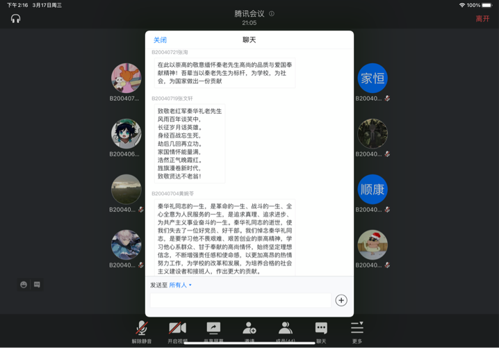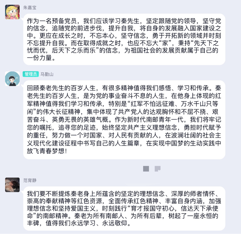 yl23411永利官网2020级各团支部也于3月17日开展秦老事迹线上讨论会,旨在缅怀秦老,勉励南邮青年继往开来。讨论会介绍了与秦老相关的南邮发展历程以及秦华礼老先生的红色事迹,让同学们深入了解了秦老为南邮做出的巨大贡献,并深刻领会了秦老的精神。在“我想对秦老说”环节中,大家积极讨论,踊跃发言,道出自己的心声,以文字的形式表达内心深处对秦老的钦慕和怀念,表明自己要不断拼搏进取、开创未来的坚定信念。