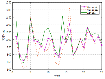 提高光伏功率预测精度后的能量优化调度成本曲线 图中绿色线条表示每日实际最优运行成本曲线,紫色星号线表示修正后的运行成本曲线,红色虚线表示采用原始方法获得预测值所计算的运行优化值。在中,原始成本和实际的每日成本的最大绝对偏差为219.6元,而在修订后该差异缩小到139.6元。可见经过本项目提成自使用光伏功率补偿预测修正后的能量优化调度运营成本更接近于实际的最优结果。